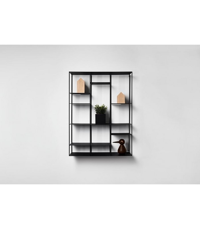 A decorative but functional wall shelf unit made of coated steel. Spaces of different sizes arise by vertical, continuous rods and thin boards of varying lengths. Like in a treasure box every object finds a suitable place. The arrangement of the boards creates a graphic melody, which gives the shelf an interesting and slender appearance.